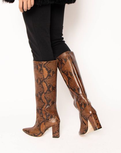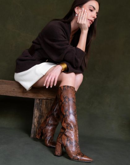 Brooklyn combina presencia y sofisticación en una silueta que se impone con naturalidad. Confeccionada a mano en piel con acabado animal print, su caña recta y estilizada abraza la pierna hasta justo debajo de la rodilla, aportando una línea limpia y favorecedora.