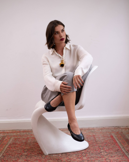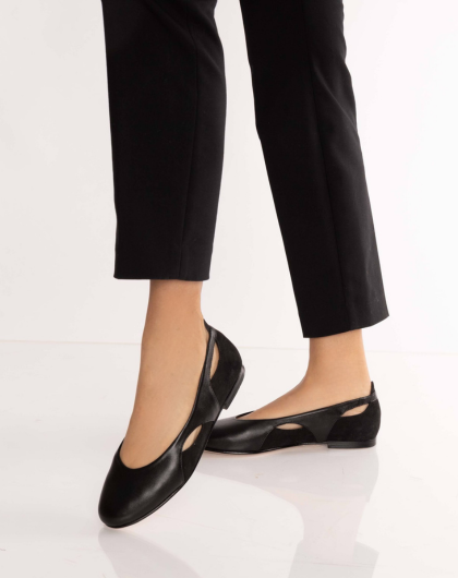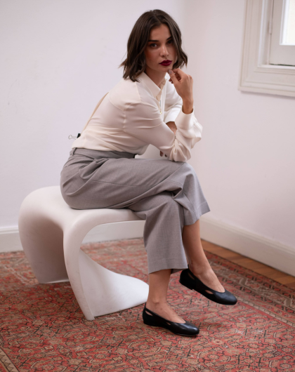 Araceli redefine la balerina contemporánea con un diseño que combina líneas limpias y sutiles aberturas laterales para aportar ligereza visual. Confeccionada a mano en piel y ante, su contraste de texturas aporta profundidad y discreto dinamismo al diseño.