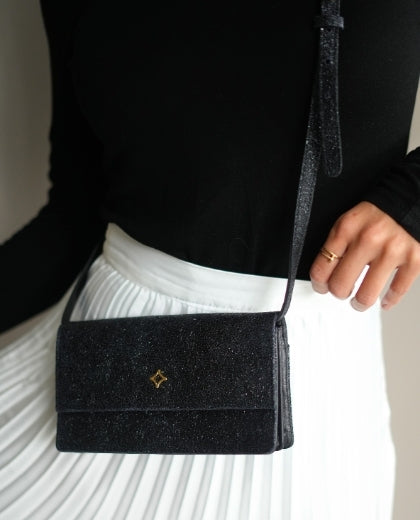 "Esta cartera en azul marino es perfecta. El tamaño es ideal, la piel es de excelente calidad, y el color combina fácilmente con cualquier look. La correa ajustable le da una gran versatilidad."