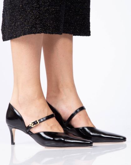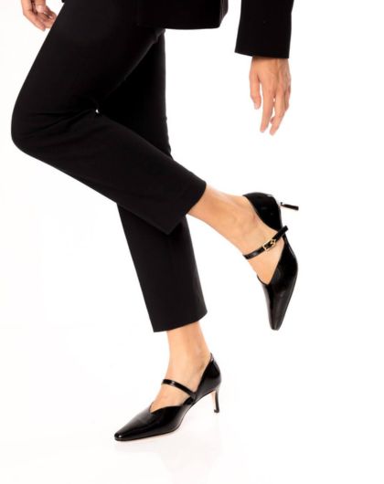 Emilia presenta una silueta estilizada con escote asimétrico y pulsera delgada que estructura el empeine con precisión. La piel acharolada, de acabado impecable, realza la limpieza del diseño y proyecta una elegancia discreta y contemporánea.