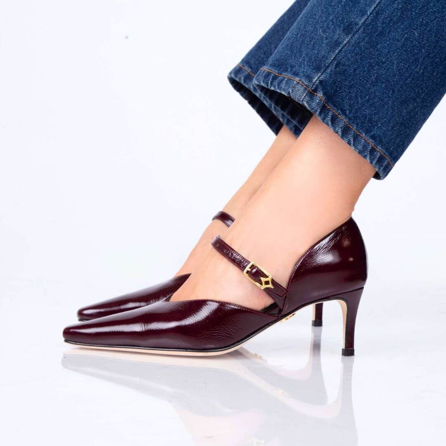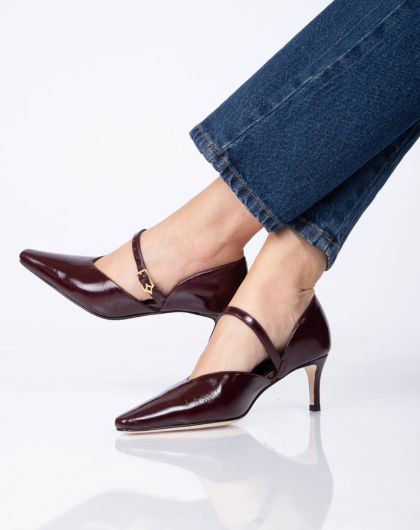 Emilia presenta una silueta estilizada con escote asimétrico y pulsera delgada que estructura el empeine con precisión. La piel acharolada, de acabado impecable, realza la limpieza del diseño y proyecta una elegancia discreta y contemporánea.