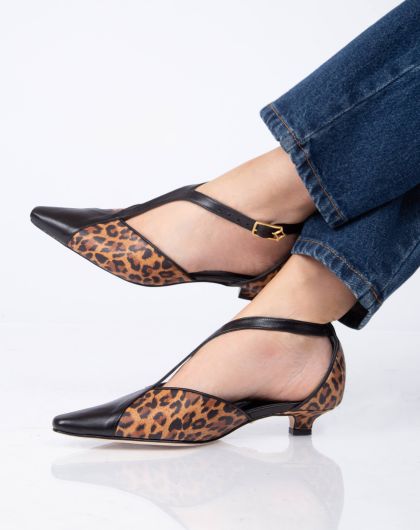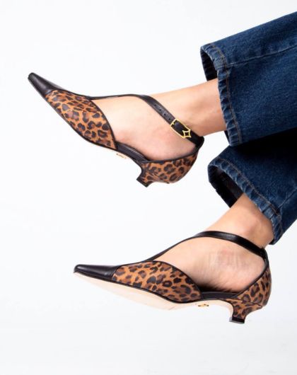 Fiorella reinterpreta el animal print con un enfoque refinado: franjas en blanco y negro, trabajadas sobre piel con textura natural, que se integran con cortes asimétricos y líneas limpias. El ajuste delicado y el perfil estilizado lo convierten en un calzado versátil para un guardarropa seleccionado, donde cada pieza tiene intención.