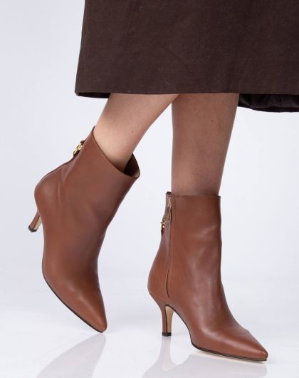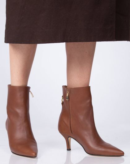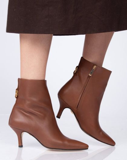 Su forma estilizada se adapta con naturalidad al pie, mientras el detalle discreto en el talón aporta un acento distintivo sin romper la armonía del modelo. El tacón, de proporciones equilibradas, ofrece soporte y ligereza, convirtiendo a Melania en un botín que acompaña el ritmo diario con elegancia serena.