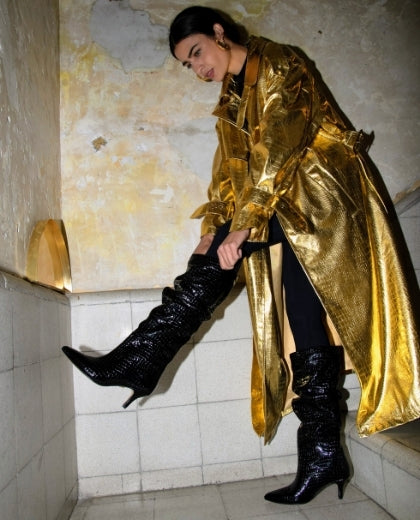 Explora la elegancia audaz con nuestra bota alta hasta la rodilla, que presenta texturas de croco bold drapeadas para un efecto llamativo y sofisticado. Este statement icónico combina charol y metálicos para un toque de glamour adicional. Con su énfasis en textura y profundidad, esta bota no solo es un accesorio, es una declaración de estilo. Además, su tacón bajo super cómodo garantiza una comodidad excepcional sin sacrificar el estilo.