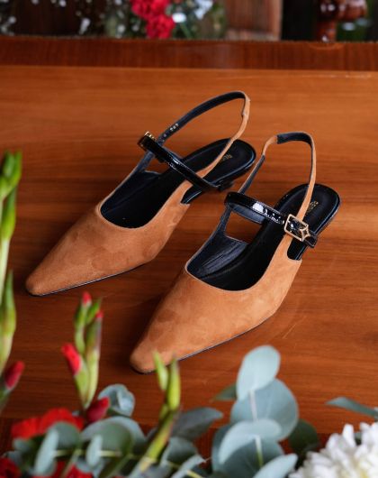 Vanina es una zapatilla que combina ligereza y distinción en una silueta destalonada, realzada por una correa fina que asegura el pie con discreción. La armonía entre el brillo pulido del charol y la textura suave del ante —o de la piel mate— aporta profundidad visual y un carácter refinado, sin excesos.
