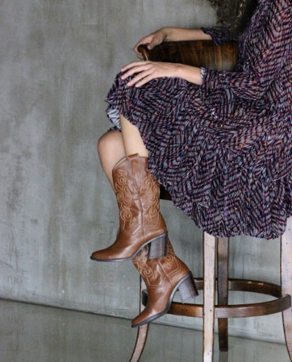 Nuestra bota vaquera, elegante y sofisticada creada en nuestra silueta característica. Hecha en suaves pieles y bordada con gran detalle logrará complementar cada uno de tus looks.
