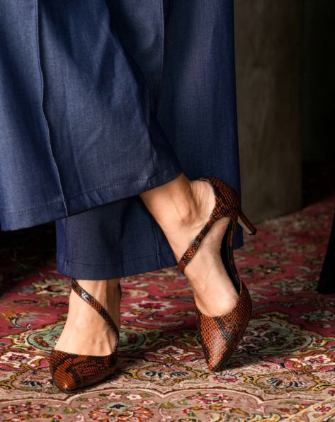 Anthea es una zapatilla de líneas asimétricas que redefine el allure clásico con un carácter contemporáneo. Confeccionada a mano en piel genuina con acabado tipo animal print, abraza el pie con una estructura precisa que aporta firmeza y realza la silueta.