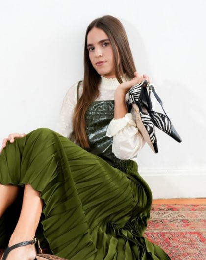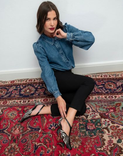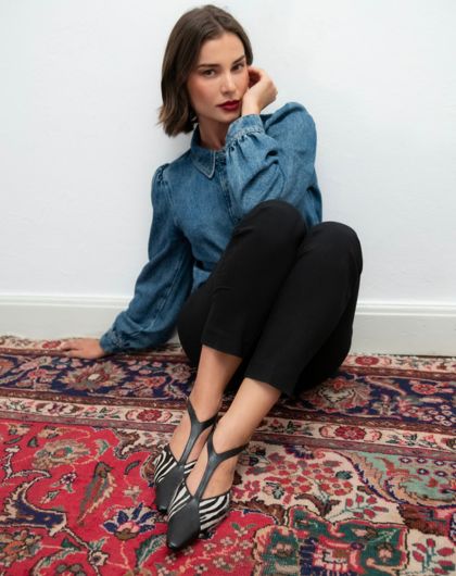 Fiorella reinterpreta el animal print con un enfoque refinado: franjas en blanco y negro, trabajadas sobre piel con textura natural, que se integran con cortes asimétricos y líneas limpias. El ajuste delicado y el perfil estilizado lo convierten en un calzado versátil para un guardarropa seleccionado, donde cada pieza tiene intención.