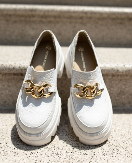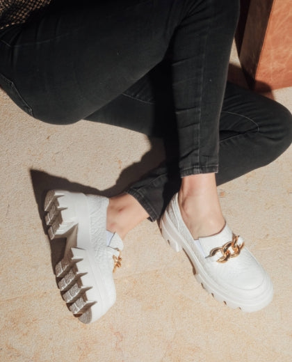 Discover Raquel. This urban tennis shoe from Regina Romero will become your favorite footwear for any occasion. Its design stands out for its chain-type hardware on the front, adding a distinctive and unique touch.